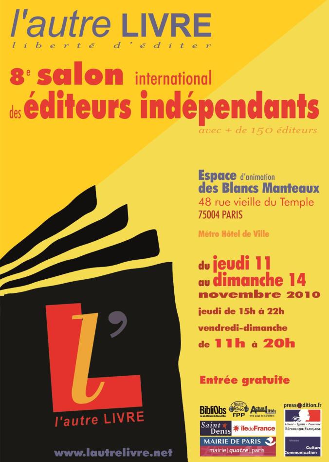 Poésie/première est présente (stand A32) au Salon de l’autre Livre, 8e salon international des éditeurs indépendants avec les dernières publications des éditions EditinteR et Fondencre, du jeudi 11 novembre (15 h ) au dimanche 14 (20 h), Espace des Blancs Manteaux 48, rue Vieille du Temple 75004 PARIS.
