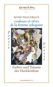 Rome Deguergue, Couleurs et rêves de la femme arlequine, bilingue français/allemand, Ed. Alain Baudry et Cie, 2011. Appétence pour le verbe en jachère, les jeux de lettres, la caresse des oxymores, le génie des mots, les contrastes de silences immanents, la palette enchantée d’un peintre dont l’oiseau perce la toile et s’envole. Découvrir ce recueil, c’est prendre le risque d’être ébloui par une sensualité démâtée, happé par le vertige de rites solaires, cloué sur un arc-en-ciel d’images.