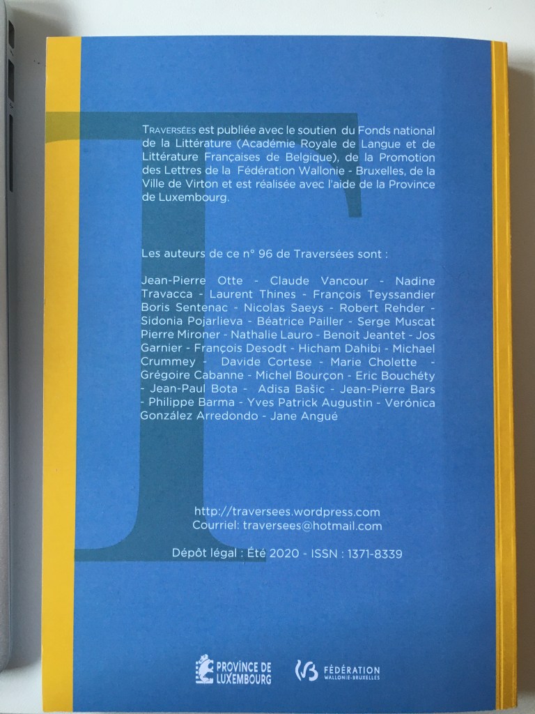 Traversées N°96 -Été 2020 11 septembre 20209 novembre 2020 / lievenn RetourVotre message a été envoyé Nom(obligatoire) Attention E-mail(obligatoire) Attention Numéro de téléphone Attention Vous désirez vous abonner à la revue Traversées Un seul numéro 10€ (précisez lequel) Un abonnement d'un an – 4 numéros 30€ Attention Vous pouvez verser le montant correspondant à votre achat au compte bancaire n° 088.2136790.69(CODE IBAN : BE71 0882 1367 9069 – CODE BIC : GKCCBEBB)de Traversées, Faubourg d’Arival, 43 à 6760 VIRTON (Belgique) Pour la France, vous pouvez envoyer un chèque libellé au nom de Patrice Breno43, Faubourg d’Arival6760 VIRTON (Belgique)ou verser le montant de l’abonnement ou du numéro voulu au compte bancaire :IBAN : FR03 2004 1010 1010 2874 7F03 187 – BIC : PSSTFRPPNCY (Un relevé d’identité bancaire peut vous être envoyé sur simple demande) Autres détails- adresse de livraison(obligatoire) Attention Attention ! EnvoyerEnvoi du formulaire Δ Partager :Partager sur Tumblr Cliquer pour envoyer un lien par e-mail à un ami(ouvre dans une nouvelle fenêtre) E-mail TweetJ’aime chargement… Similaire