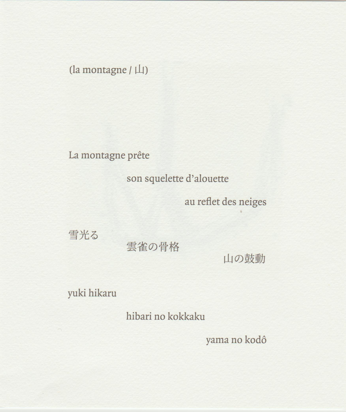 Yuka Matsui n’hésite pas, de son côté, à en caractériser, voire caricaturer l‘élévation (sans laquelle aucun relief ne pourrait s’appuyer sur lui-même) et l’érosion (dans laquelle d’autres éléments, justement, viennent attendir et creuser le sien). Cette sorte de M sur support que propose ici la calligraphe (où l’entaillement bute sur de l’incompressible, où l’escarpement dévale le toboggan brisé du temps) dit merveilleusement l’intimité universelle de l’élément montagne. Et l’on découvrira les analogues et fortes approches présentées dans le livret.