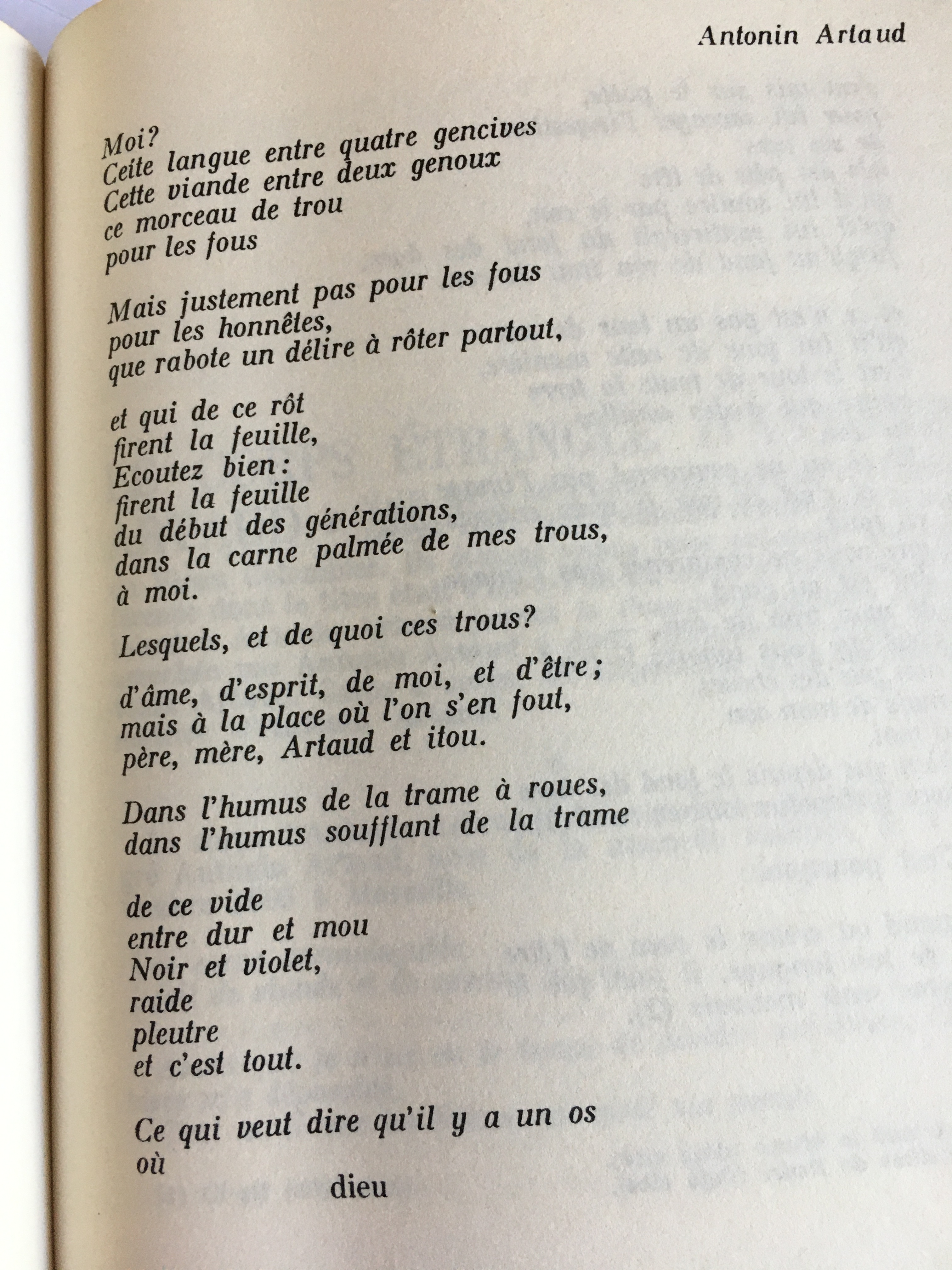 Il y a un mur infranchissable, une incompatibilité entre deux systèmes distincts de réalités. « Les tours par lesquels on s’exprime », les habitudes du langage, ses conventions, n’expriment rien et ne traduisent pas avec exactitude. Il y a une inaptitude de nature du mot. Le mot n’est qu’un signe et lui, Antonin Artaud est rupture et destruction en acte. Il abandonne ce qu’un homme doit aux autres hommes. Dénoué, vagissant, effondré, Artaud souffre, la chair affectée par une asphyxie centrale.