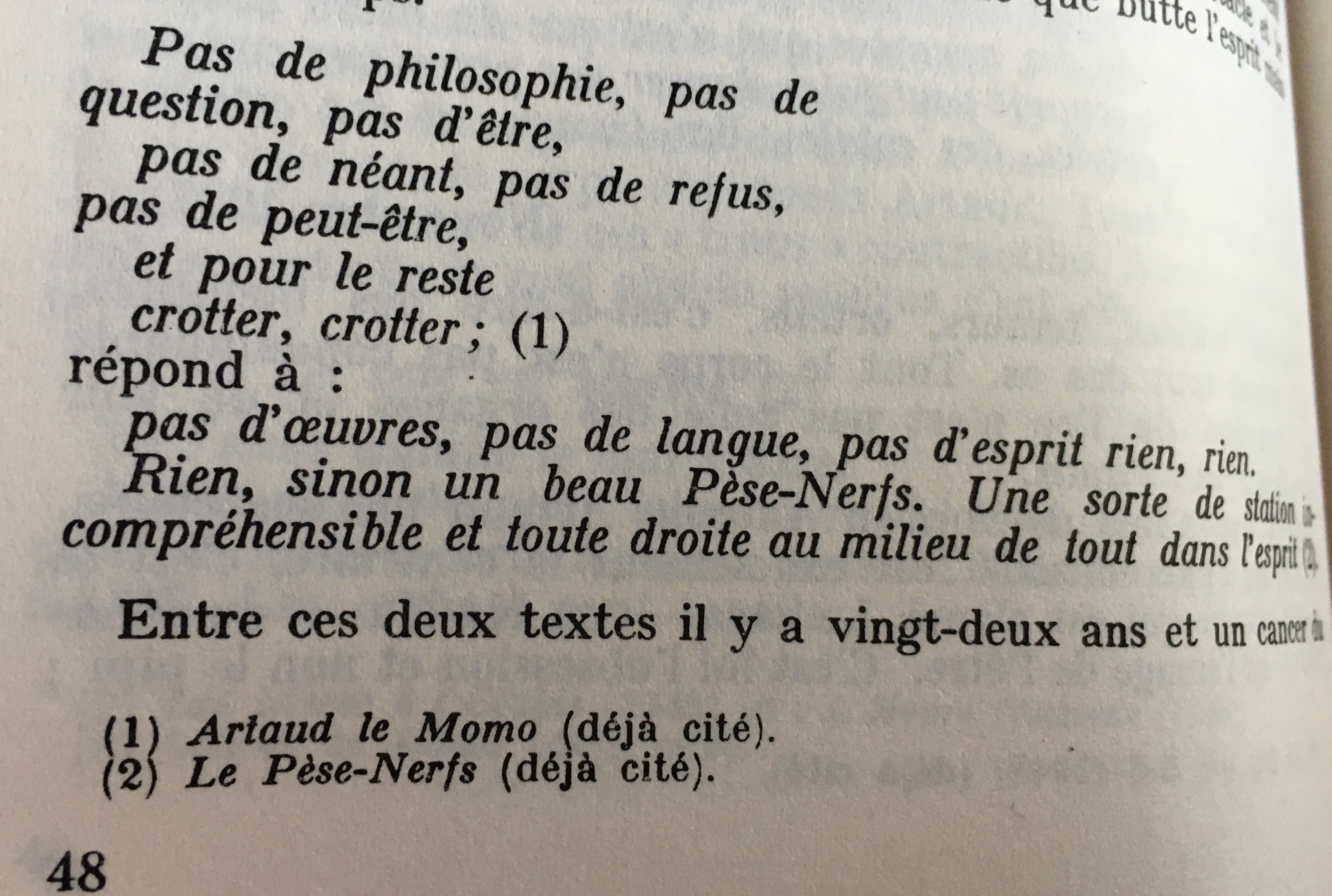 Depuis son retranchement, Artaud constate « dans l’éparpillement de ses poèmes » « un effondrement central de l’âme, une espèce d’érosion essentielle à la fois et fugace de la pensée ». Artaud a senti en lui, un manque congénital et prédestiné, ce qu’il manque à la vie.