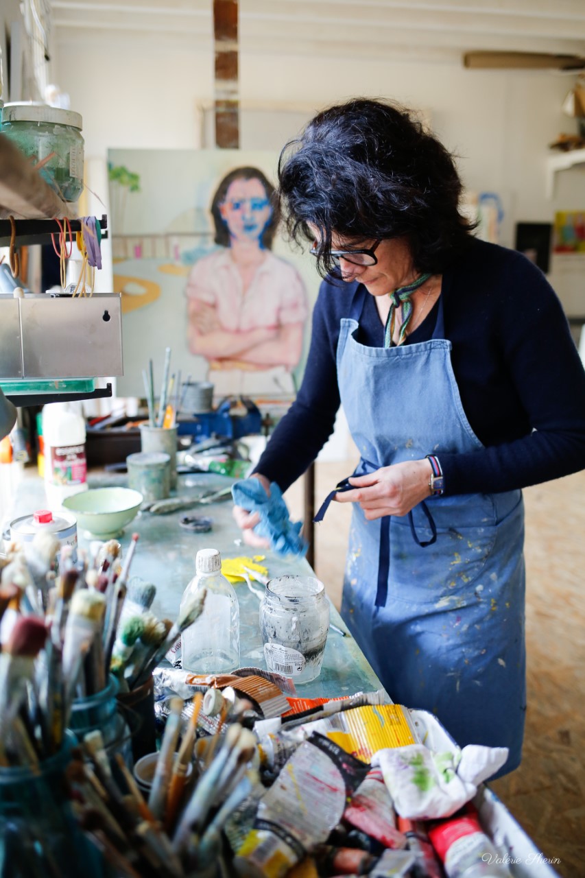 Faire face au vide participe de cette tension entre gravité et légèreté : la peintre nous renvoie à des vides denses, blancs ou très colorés, qui cernent des figures moins texturées, comme une nappe mouvante : « Je vois beaucoup les vides et je vois beaucoup par les vides. Ils font les formes ». Viennent-ils envelopper, soutenir ou peser ? Parfois, ils mangent les contours, rognent, créant un risque d’asphyxie, parfois ils délivrent. Et ce travail avec les repentirs, comme avec les vides, inscrit, dans la toile, le temps de la création : quand elle commence un tableau, la peintre peut « le mettre de côté, le retourner, y revenir plus tard. Mes toiles les plus riches sont celles que je reprends trois ou quatre mois après. Le défi, c’est que la composition tienne debout, que les couleurs vibrent entre elles, que le sujet devienne secondaire. Même s’il ne l’est pas du tout en fait. »