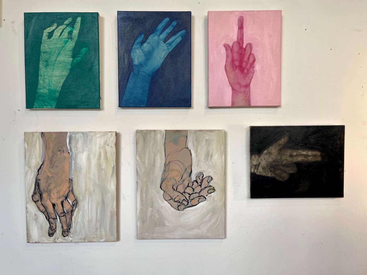 Souvent les corps humains se fragmentent : une main, un pied, s’affirment au cœur de la toile. La main, surtout, une « marque de fabrique », explique Laure Carré. Mains entières, mains déformées, mains incomplètes, mains vives toujours. Depuis ses trente ans, l’artiste est confrontée à un problème héréditaire, une rétraction progressive des doigts, que les opérations soignent temporairement. Elle riposte avec ses pinceaux, peint de la main gauche quand la droite est immobilisée par une orthèse. Parfois, les mains se détachent, au centre d’un portrait ou autoportrait, en masquant les lèvres, parce qu’elles ont davantage à confier, peut-être un jour…