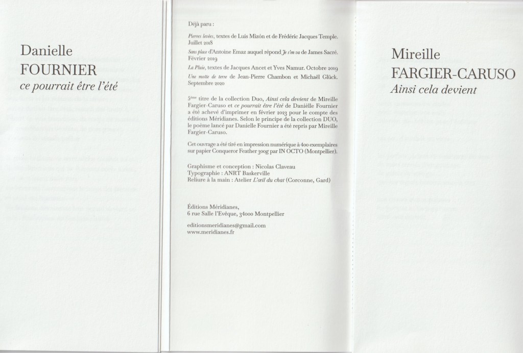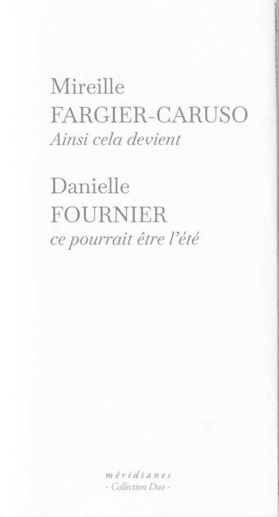 Danielle FOURNIER, ce pourrait être l’été, suivi de Mireille FARGIER-CARUSO, ainsi cela devient, collection Duo, Editions Méridianes (Montpellier), 2023, 12 €