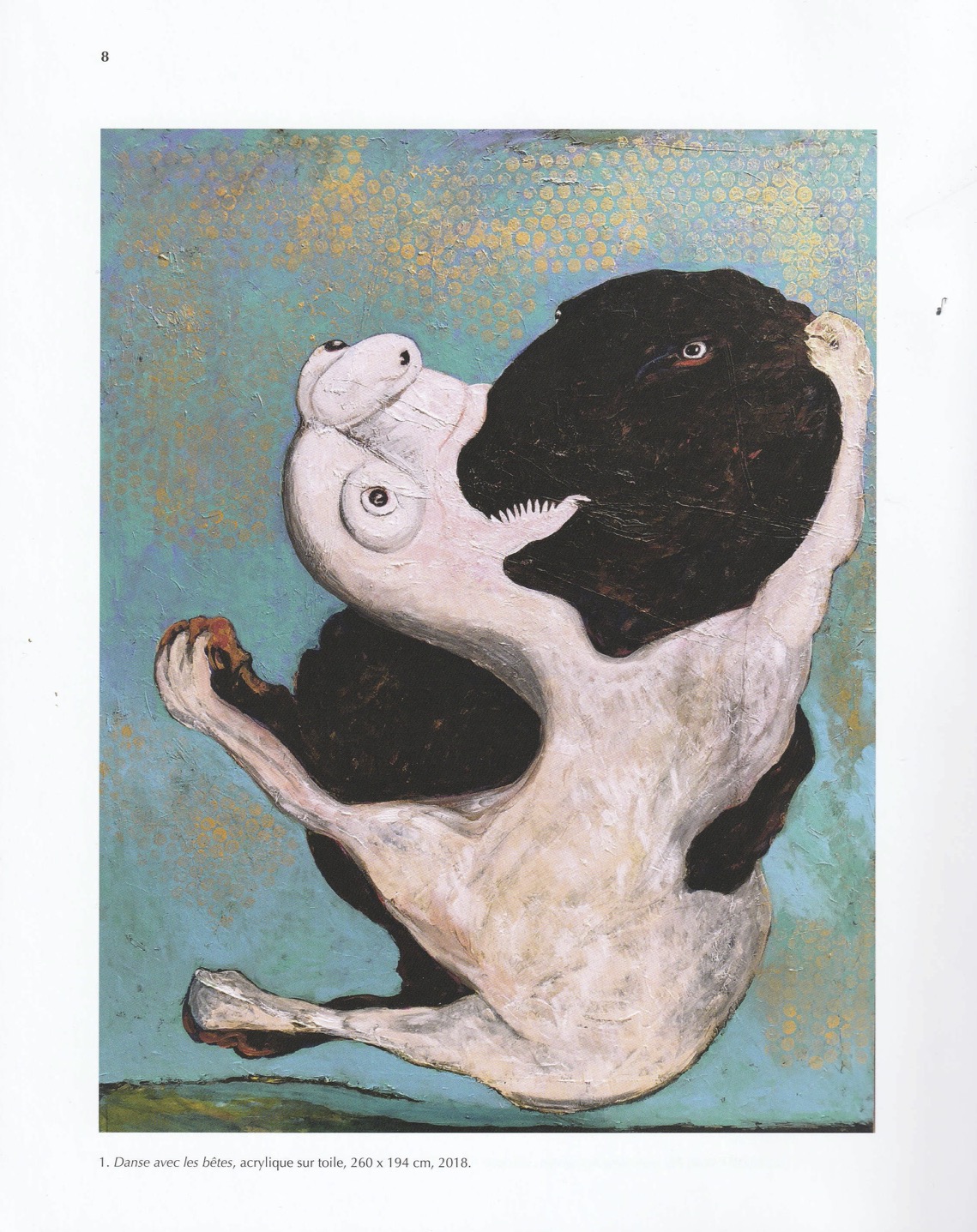 Guérin rappelle d’abord que le rêve est à la fois ignare et infaillible. Ignare car, comme l’estiment Alain ou Valéry, il n’est que l’écho, à l’insu de lui-même, sans horloge externe ni perspectives redressables, de ce qui agite un pauvre corps endormi; infaillible car, comme l’estiment Freud ou Benjamin, il sait mieux que la pensée diurne où veut en venir le désir et ce que peut être une illumination artisanale (avec purs moyens du bord), profane (sans les mensonges du sacré) et souveraine (car ce qui décide de ce qu’il rêve, le rêveur ne l’a, même lui échappant, qu’en lui !). Toute la méditation poursuivie dans le livre vise à établir la possible conciliation par une oeuvre picturale de ces deux aspects, à savoir « entre un rêve qui n’est que corps et meurt avec lui et un autre qui n’est rien que fantasme, désir souffrant que dissipe le jour« (p.97-98), tant il est vrai que, de même que quelque chose préfigure l’humain dans la capacité onirique de la bête, quelque chose reste solidaire de la bête dans la puissance sans pareille du délire humain. L’art pictural en général (et celui de Richard Conte en particulier), estime Guérin, est lui aussi à cheval – mais victorieusement – sur ces deux aspects : le rêve est contraire à la réalité, mais il est réel; l’image surgit, non nécessairement comme une forme, mais toujours pourtant comme une figure. La réalité est la communauté partageable et arbitrable des choses (le contraire du rêve, donc), mais le réel est une présence sur laquelle on bute, car elle provient d’elle-même, il est le non-négociable et non-différable « sensorium d’un choc » (p.18), il porte avec lui le socle secret de sa production (comme le rêve, advenue à la fois insaisissable et irrésistible). L’opposition qu’établit Guérin entre forme et figure est analogue : la forme se distingue d’un fond pour protéger de lui ses propres aspects, pour installer à demeure ses propriétés acquises; la forme est statique et déterminée, car il n’existe pas de danse de détention, ni de physionomie d’un devenir. La figure, à l’inverse, naît dans le mouvement qui la fait advenir, se fait arriver elle-même à présence, initie son propre cours : la forme ignore la gradation interne, est incapable de réticence comme de surenchère, et, au contraire de la figure qui est où elle va se présenter, la forme vient être où elle est représentée. Cette dualité figure/forme, propre à la pensée de Guérin, éclaire bien ici l’advenue picturale de l’animalité comme l’émergente animation de la pâte colorée de Richard Conte. Comme émergent ici la Peste – c’est-à-dire Poutid et la Covine ? -, une chauve-souris borgne, la science occidentale et ses ironiques mains « vertes », les paillettes kitsch d’un firmament, et un Monsieur N’importe qui en cravate-léopard et masque de … fin de récréation !