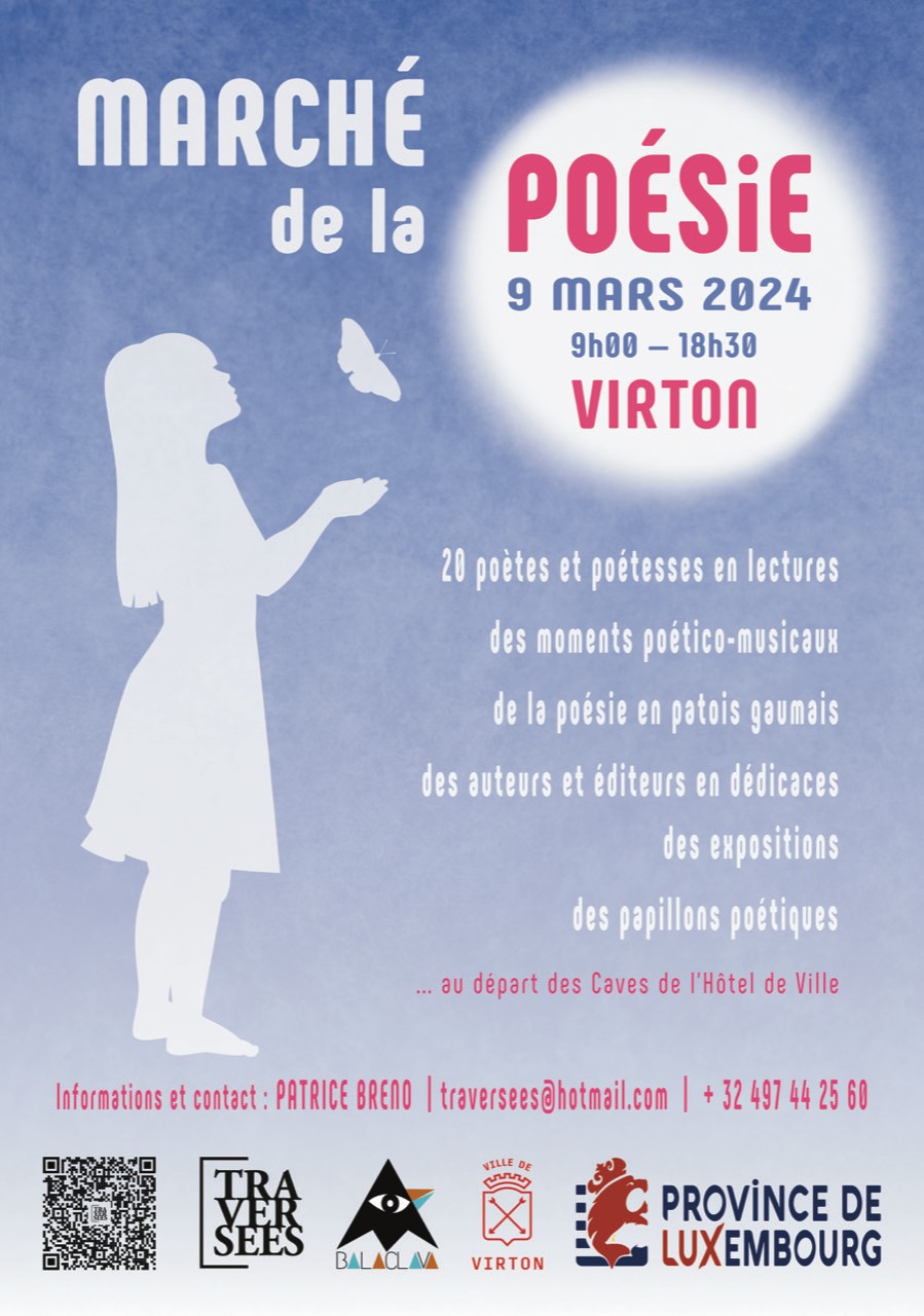 Actualité- Marché de la poésie de Virton 2 février 2024 / lievenn / 1 commentaire Amoureux de la poésie ou non, vous êtes toutes et tous les bienvenus. Partager :Partager sur Tumblr Cliquer pour envoyer un lien par e-mail à un ami(ouvre dans une nouvelle fenêtre) E-mail TweetJ’aime chargement…