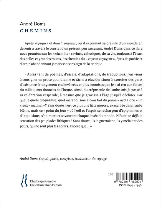 André Doms, Chemins, Frontispice de Sébastien Dugué, Éditions L’herbe qui tremble, Collection Trait d’union, 2023, 144 pages, 18€,