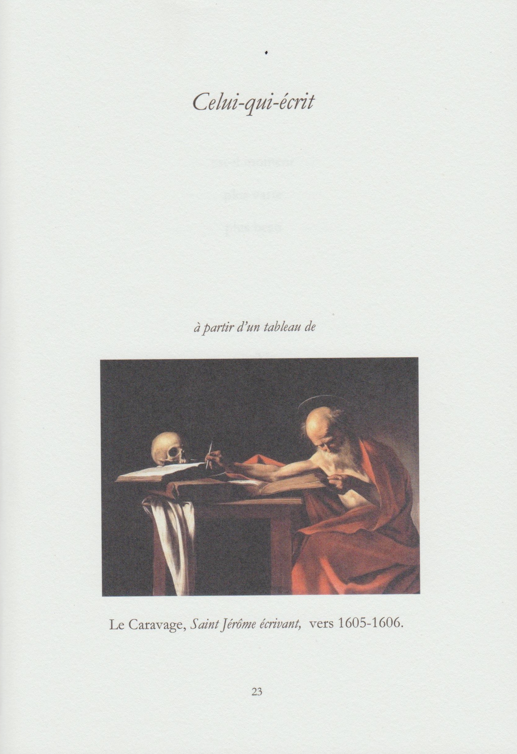 Reste les quelques images d’Agnès Charve (fines et précieuses) qui ponctuent, par contraste heureux, le recueil. On n’y verra donc pas du tout illustrations du texte (la peintre, par fonction, illustre ce que sait faire la lumière, nous met à même distance des parties d’une scène « à plat », nous permet d’inspecter l’entre-voisinage des formes et l’entreposition des objets ou éléments – ce qu’aucune parole ne peut ni ne doit réussir !), mais (comme l’indique Christian Ducos lui-même) ce sont là « pauses » bienvenues, « brèches » utiles, natures mortes parce qu’elles n’ont justement pas, elles, à se comprendre vivre, ni à cultiver leur image ! La plus belle frondaison du monde n’aura jamais le moindre usage d’un miroir que notre seule perplexe identité se tend à elle-même.