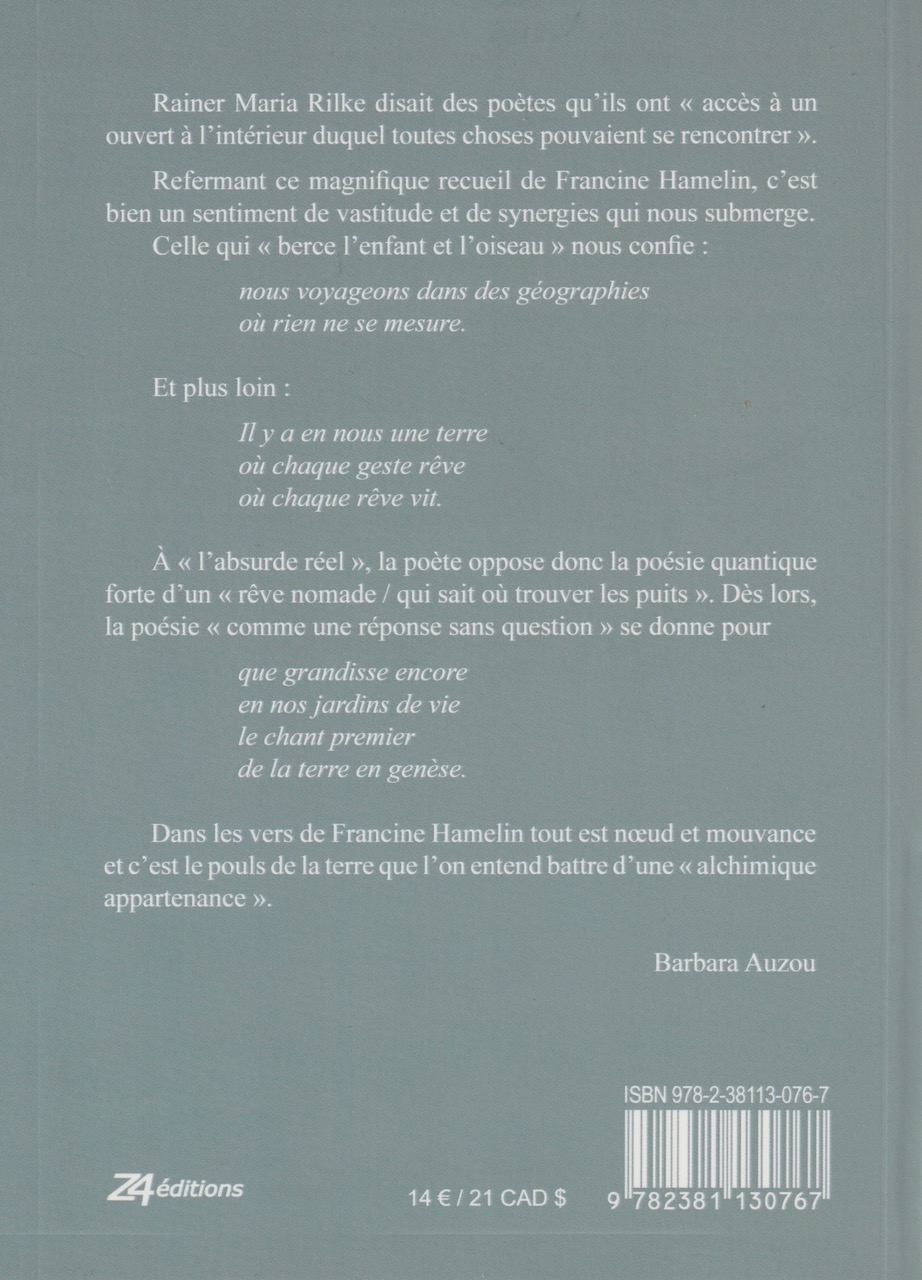 Au sablier des heures s’égrènent constellations qui s’éternisent d’éternité, sources et corolles, complicités fraternelles, conjugaisons de choses minuscules mais essentielles où s’attellent oublis, aimables réminiscences, argiles et humus de notre condition humaine.