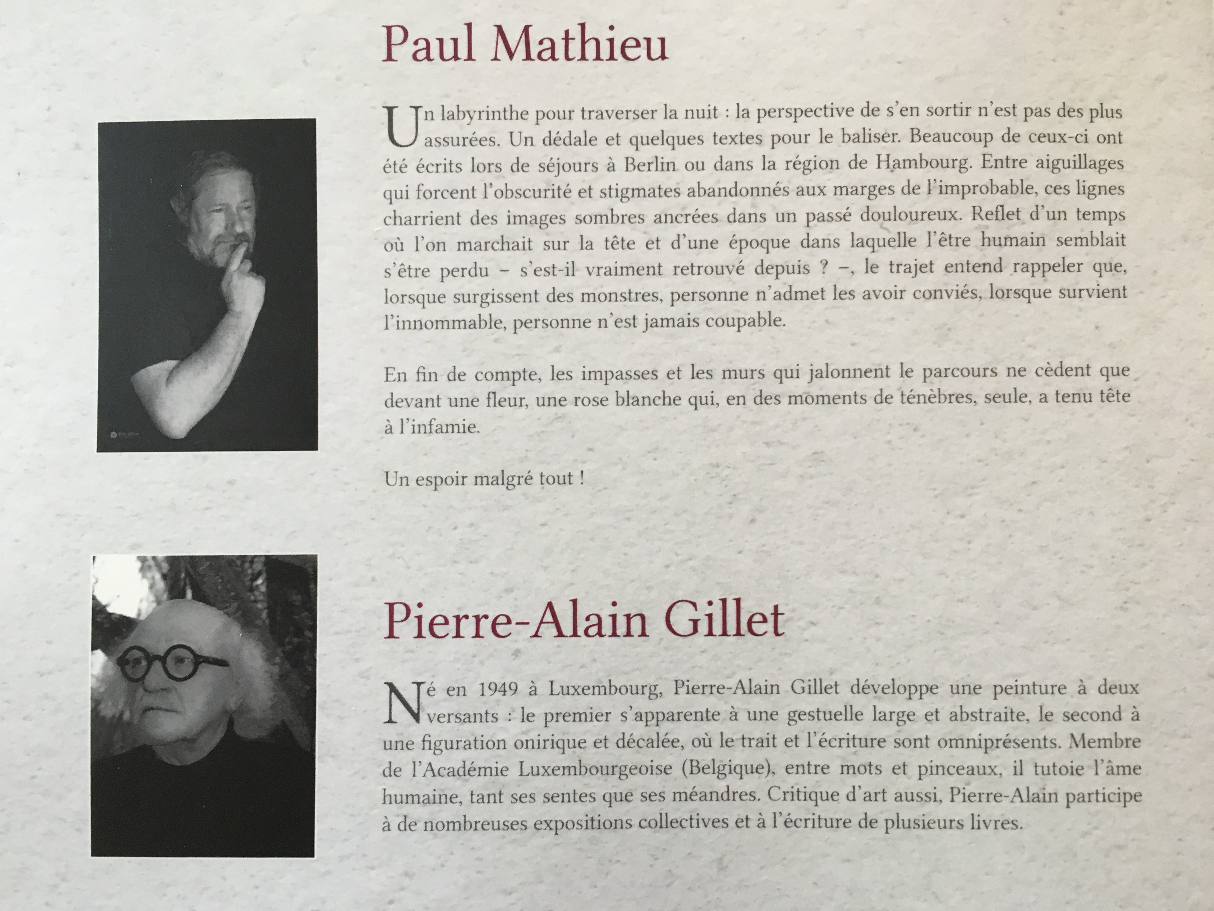 Solitude de l’être en son labyrinthe. Graffitis jetés sur la peau des murs, lutte des mots et des signes sur la page, convergeant vers une même fulgurance. Les gestes picturaux de Pierre-Alain Gillet viennent ici à point nommé et rehaussent encore d’un cran le propos.