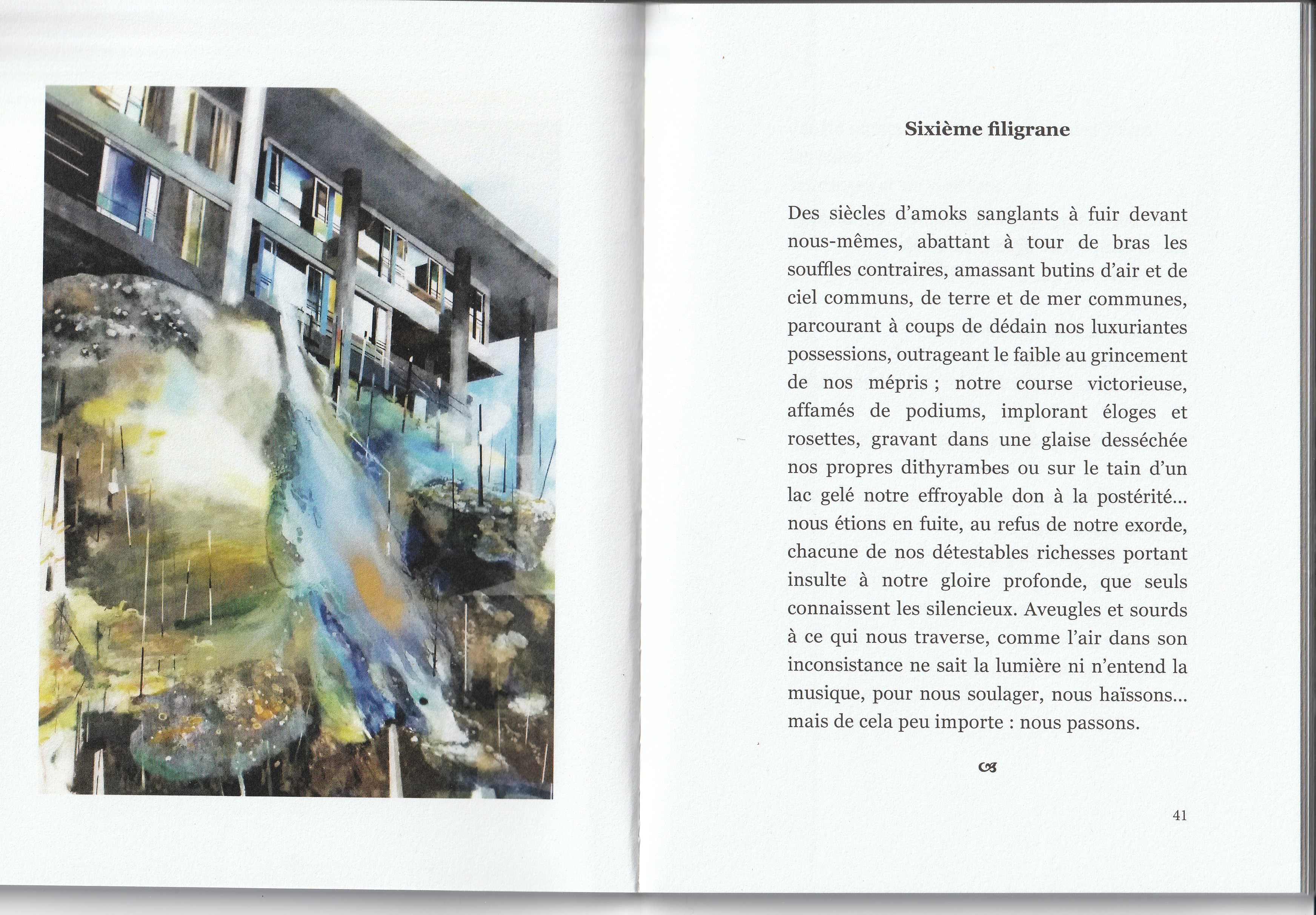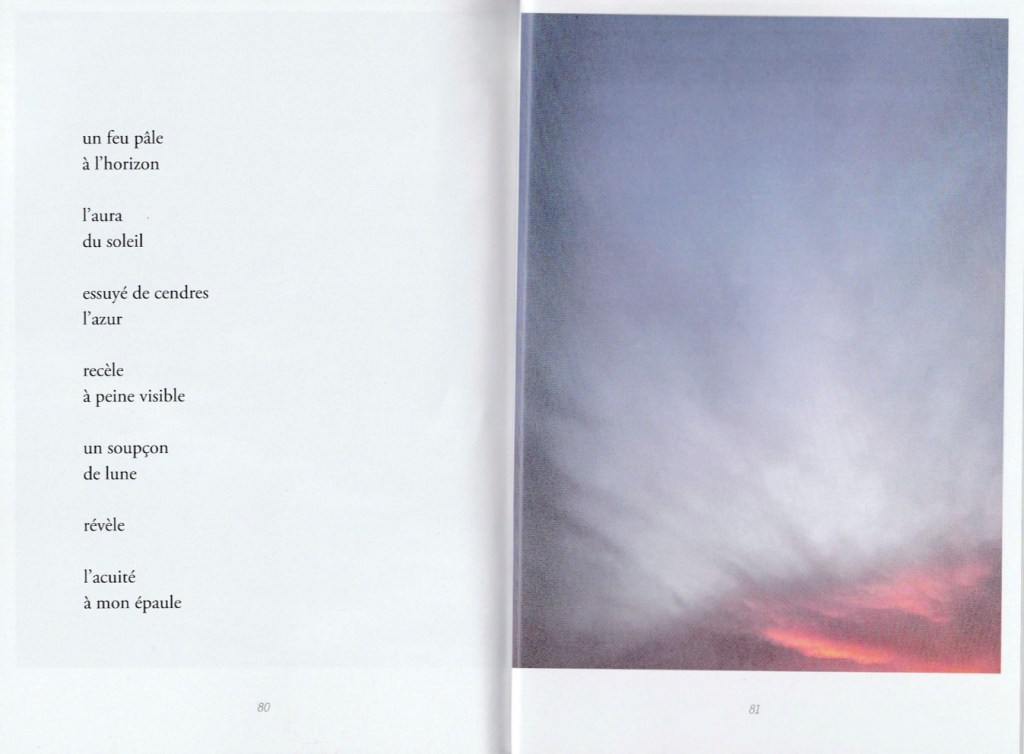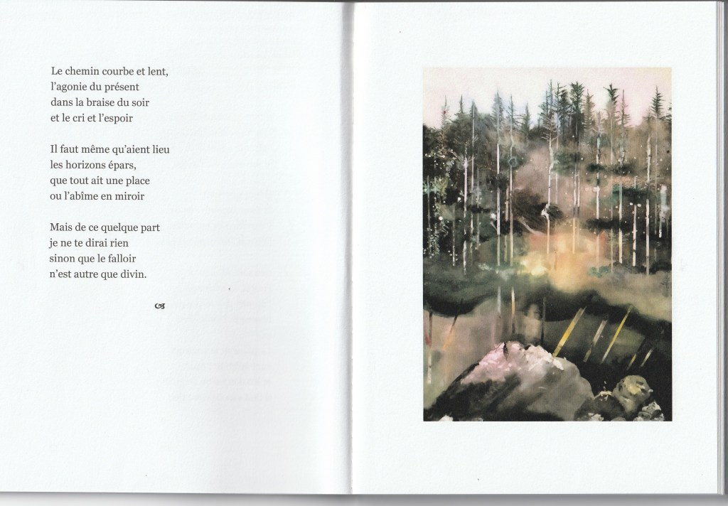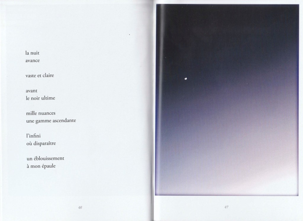 C’est un recueil conçu sur un lit d’hôpital, dicté au téléphone par quelqu’un de très affaibli (la septicémie gagne le corps, une main malade risque d’être perdue, diverses affections annexes se déclarent). Ce n’est donc pas un texte drôle, divertissant, ce n’est pas l’heure d’avoir de l’humour, de feindre de se réjouir, de rire ou de faire rire de ce qui nous arrive. Car ce qui arrive, c’est la fin. Alors c’est grave, et le ton est grave. Ce n’est donc pas non plus un texte virtuose, sûr de soi, astucieux ou malin, mais un texte laborieux et modeste (car survivre est un travail, et cette survie s’obtient de justesse. Un travail, c’est une force de vie qui doit se déplacer d’urgence, s’appliquer autrement, improviser là où on ne sait pas faire). Et enfin ce n’est pas un texte achevé, définitif, auto-suffisant : c’est le contraire d’un testament, parce que dans un testament il n’y a pas de points de suspension, et il n’y a pas d’images. Là, il y en a : le texte hésite sans cesse, et des calligraphies s’offrent comme des appuis, des haltes, des sortes de garde-à-vous rassurants pour une pensée dont les mots, eux, courent dans tous les sens et risquent de s’égarer, et de tout perdre.