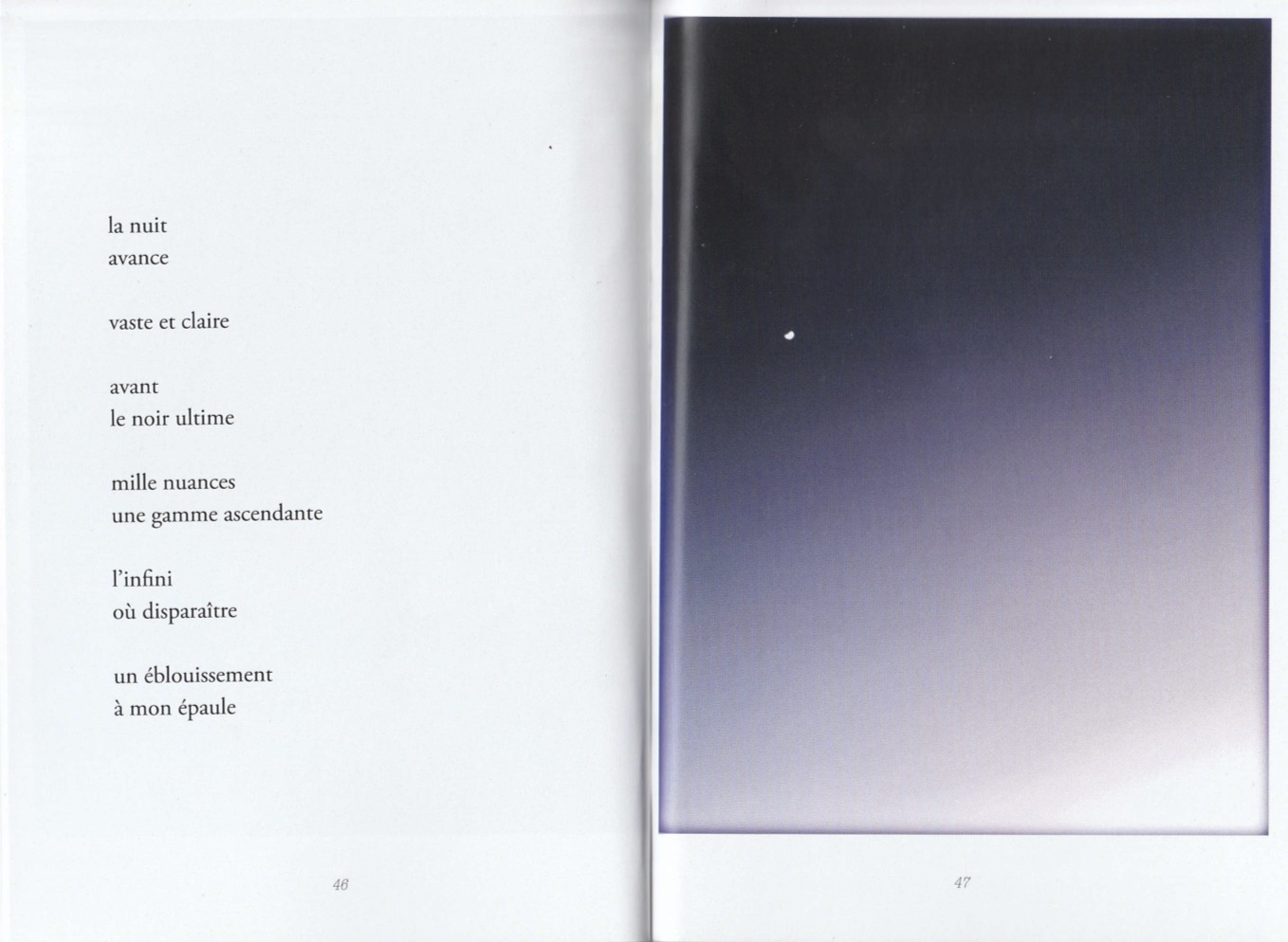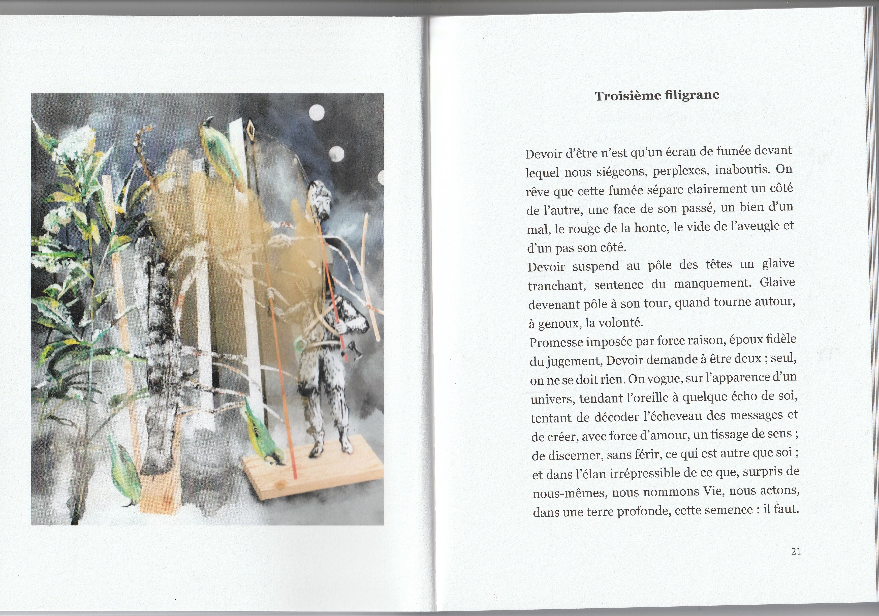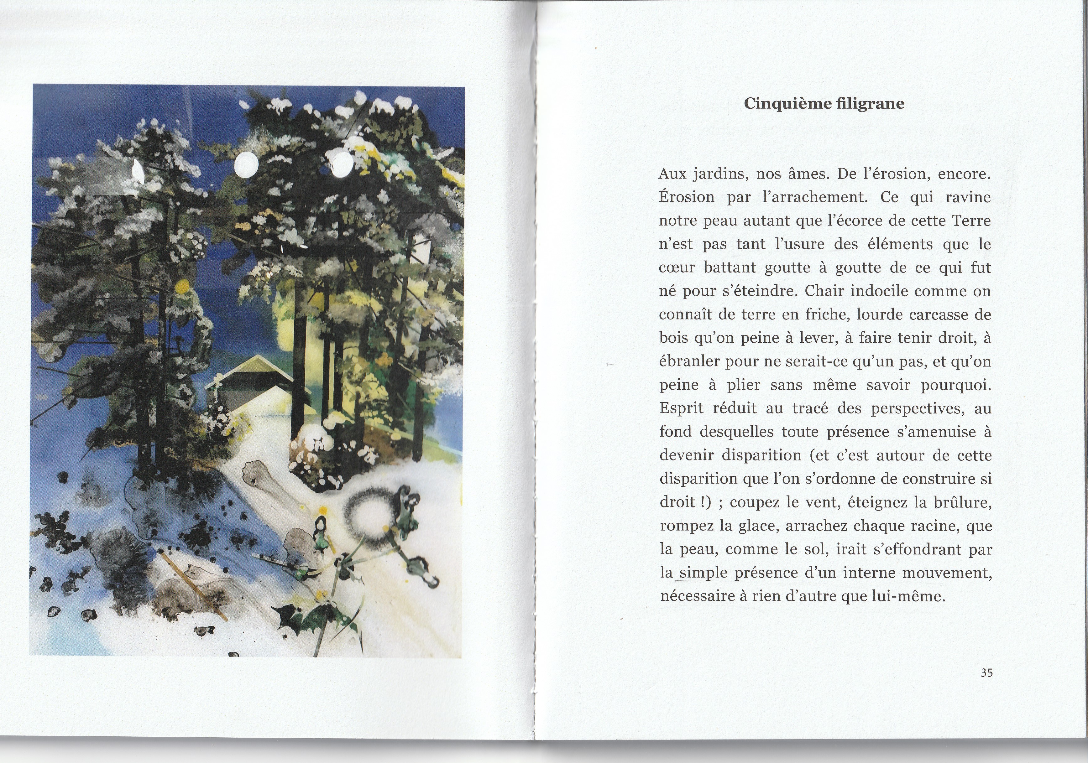 Mais c’est justement cette ombre difficile que ce texte chante et que ces calligraphies célèbrent. L’ombre est privation de lumière mais aussi protection contre elle, elle est à la fois une éclipse et un abri. Elle n’est pas du tout un morceau de nuit, car la nuit avale aussitôt toutes les ombres. L’ombre est visible, elle n’est d’ailleurs que visible (l’ombre d’un corps qui hurle est silencieuse, celle d’un corps qu’on parfume ou qui pue est inodore), elle est la pure visibilité, car si je ferme les yeux, il n’y a plus d’ombre, et c’est l’ombre de mes paupières, alors, qui tombe sur mes yeux. De même ici, dans ce profond et fraternel livre, c’est l’ombre de la vie (non celle de la mort) qui est tombée sur un corps, et l’a illuminé. L’ombre de l’enfant s’allonge, devant lui, dans la lumière du soir, mais c’est pour lui montrer, justement, le chemin de grandir.