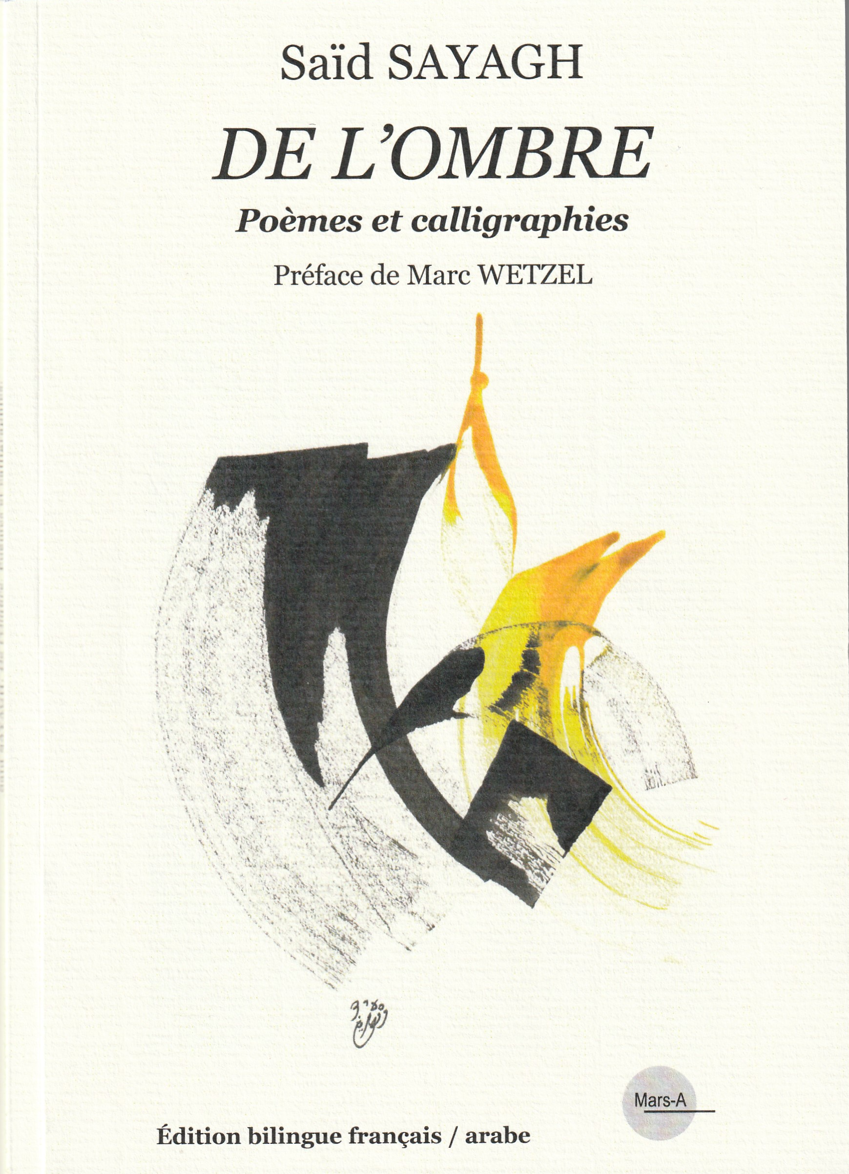Saïd SAYAGH, De l’ombre (poèmes et calligraphies), Edition bilingue français/arabe, Mars-A publications, 94 pages, 2025, 20€.
