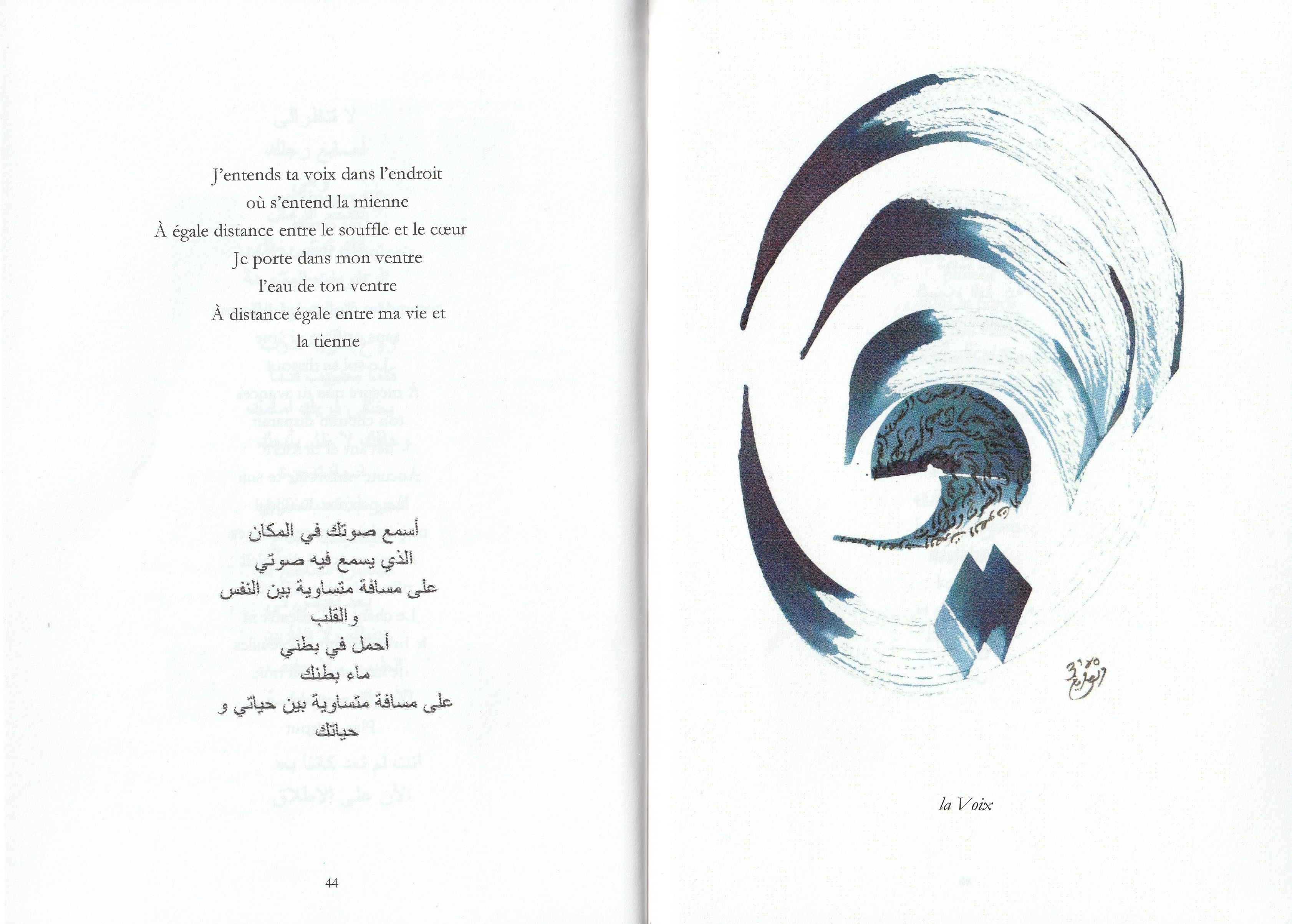 Les calligraphies, merveilleuses de netteté et d’énergie, sont aussi des hommages de la main (de l’artiste) aux mouvements bienfaisants du monde qui l’auront sauvée. Leur force singulière vient de ce que ces calligraphies sont autant d’autoportraits des diverses puissances de la vie. Car qu’est-ce que la vie ? C’est de l’eau qui se serait un peu compliqué les choses. Un organisme n’est qu’une citerne alerte et sophistiquée de fluides blanc et rouge. La cellule vivante est une eau structurée, circonscrite, compartimentée, sachant s’opposer à elle-même, une eau prodigieuse qui fait naître d’elle un nageur. La calligraphie de l’eau le montre ici, avec ce flux bleu faisant tourner sur lui-même le disque qu’il est aussi, et qu’il devient, et – comme un cyclique moulin à courants – en est renouvelé à son tour. Un peu comme la voix (autre image ici) est un vent articulé, un souffle qui se subdivise et délimite, se fait tinter et retentir lui-même, et qui relance en retour la pensée qui l’anime. Et le même corps humain est voix et silence – voix des formes et silence des fonctions. Il est aussi, superbement, à la fois la maison et le chemin.
