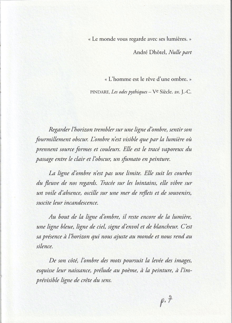 L’art donne à l’enfant (que nous pouvons jouer à rester en lui) toute la lucidité requise. Avec l’art, une libre « marée de méandres » nous offre sa confiance. Avec l’art, embarquements immédiats : en mots dans la voix d’autrui (poésie), en formes et couleurs à bord du regard d’autrui (peinture), en entailles et empreintes au coeur des gestes mêmes d’autrui (gravure). Les mots prononcés par les morts, les êtres de l’autre rive, vivent en nous et les poèmes en tissent la danse sur ce pont temporel. La peinture fait passer la lumière sous l’arche de ses toiles, et reforme indéfiniment, fait recouler dans nos regards, ce que quelqu’un aura, hier, vu mieux que tous. La gravure offre comme les lignes d’une main exemplaire et contagieuse à ceux qui voient monter d’elles les vraies couleurs du geste humain.