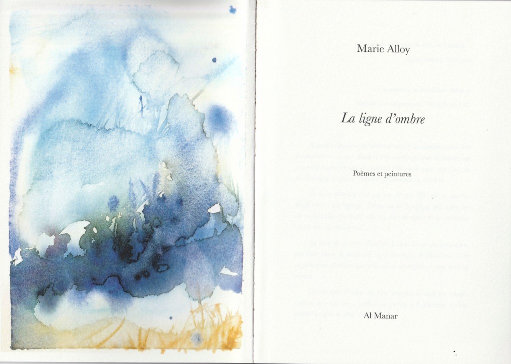 De son « journal en poèmes« , « de vie et d’atelier », qu’elle tient depuis de nombreuses années, Marie Alloy nous dit, dans la belle énigme d’une formule, qu' »ils sont écrits sur ce fond noir de tant de peintures qu’elles s’en remettent à la lumière« . Nos yeux tentent de l’y suivre.