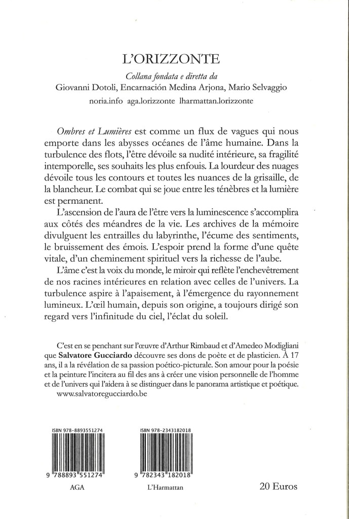Salvatore Gucciardo – « Ombres et lumières. » Préface de Giovanni Dotoli. Illustrations Salvatore Gucciardo. Editions L’HARMATTAN « AGA » collection L’ORIZZONTE – Format 14×21. Nombre de pages 113.