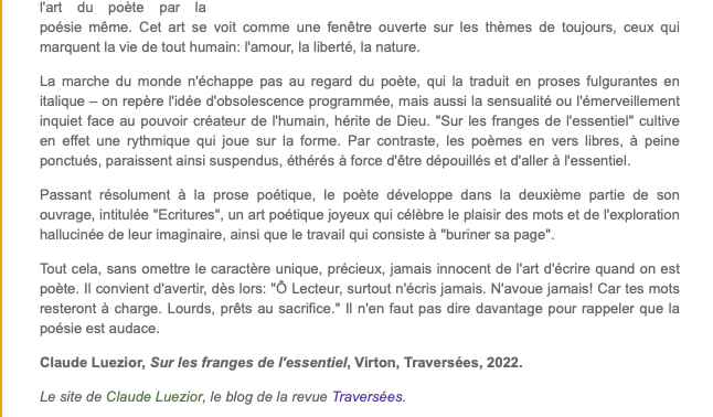« Sur les franges de l’essentiel… », cette première partie de titre incite à vérifier ses connaissances verbales avant d’engager la lecture. Selon le dictionnaire, le mot « frange », outre la coupe de cheveux bien connue, désignerait, entre autre, « une limite floue entre deux choses, deux notions », ce qui lui ouvre grand les portes du possible. Quant à « l’essentiel », s’agissant ici du nom, il désigne ce qui est le plus important, vaste domaine s’il en est. Avec cette belle formule, Claude Luezior fait preuve d’une prudente modestie. Mais à la lecture de la centaine de pages concernée, c’est bien l’âme du poète, sa culture, son talent, ses désirs comme ses souffrances qui nous sont révélés en multiples circonstances de la vie.